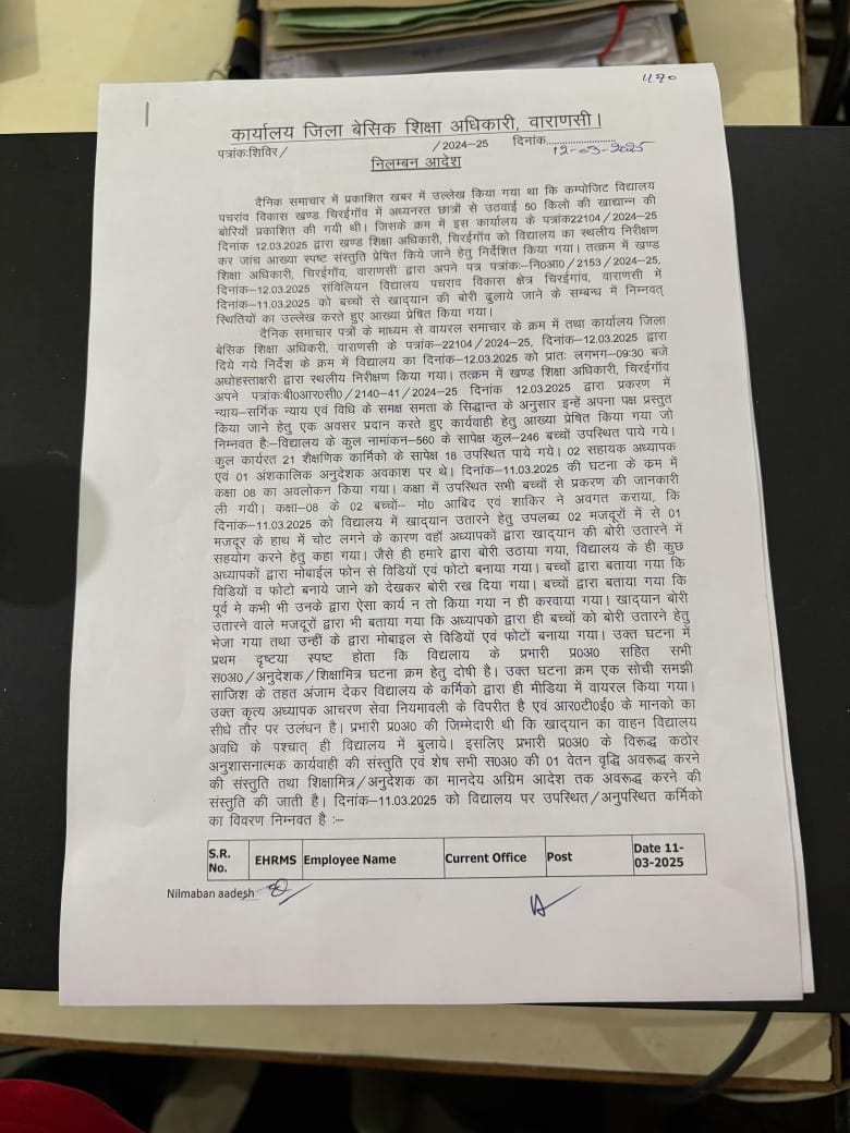छात्रों द्वारा खाद्यान्न ढुलाई के मामले में विद्यालय प्रभारी निलंबित, शिक्षकों पर कार्रवाई”