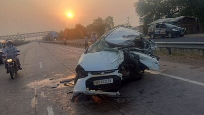वाराणसी में हाईवे पर हादसा, अज्ञात वाहन की टक्कर से कार के उड़े परखच्चे; चार लोग घायल