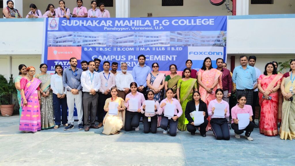सुधाकर महिला पीजी कॉलेज पांडेयपुर वाराणसी में 10 कंपनियों ने प्लेसमेंट में भाग लिया।। इस प्लेसमेंट में 98 को छात्राओं को जॉइनिंग लेटर देकर नियुक्त किया गया।। जिसमें छात्राएं चयनित हुई वह कंपनियां इस प्रकार है Tata motors , Foxconn, swiggy, Maruti Suzuki,wistron,